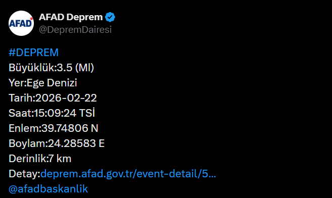 Afet ve Acil Durum Yönetimi Başkanlığı (AFAD), saat 15.09’da Ege Denizi’nde 3.5 büyüklüğünde bir deprem meydana geldiğini duyurdu.