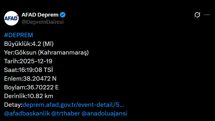 Afet ve Acil Durum (AFAD) Yönetimi Başkanlığı verilerine göre; saat 16.19 sıralarında merkez üssü Kahramanmaraş'ın Göksun ilçesinde 4.2 büyüklüğünde deprem kaydedildi.