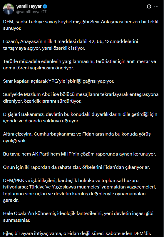 "DEM, sanki Türkiye savaş kaybetmiş gibi Sevr Anlaşması benzeri bir teklif sunuyor.