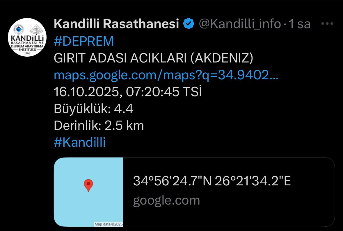 Son gelen verilere göre, Girit Adası açıklarında (Akdeniz) bir deprem meydana geldi.