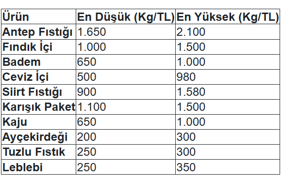 Aralık 2025 itibarıyla piyasadaki kuruyemiş fiyatları şu şekilde yansıyor: