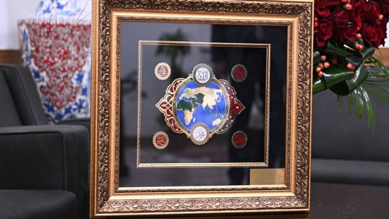 Lazer gravür tekniğiyle hazırlanan tabloda İslam ülkelerine ait harita yer alıyor. Üst bölümde “Allah”, alt bölümde “Hz. Muhammed” yazısı işlenmiş; haritanın içinde Fetih Suresi’nin 1 ve 2’nci ayetlerine, köşelere ise dört halifenin isimlerine yer verilmiş. Anadolu Türk motifleri zirkon taşlarla süslenmiş ve metal katmanlar halinde hazırlanmış tablo, özel mine boyama tekniğiyle renklendirilerek sanatsal bir ahşap çerçeve içinde tek parça olarak tasarlandı.