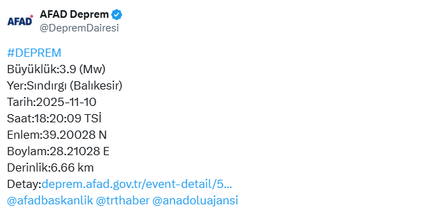 Merkez üssü Sındırgı ilçesi olarak tespit edilen deprem, yerin 6.66 kilometre derinliğinde gerçekleşti.