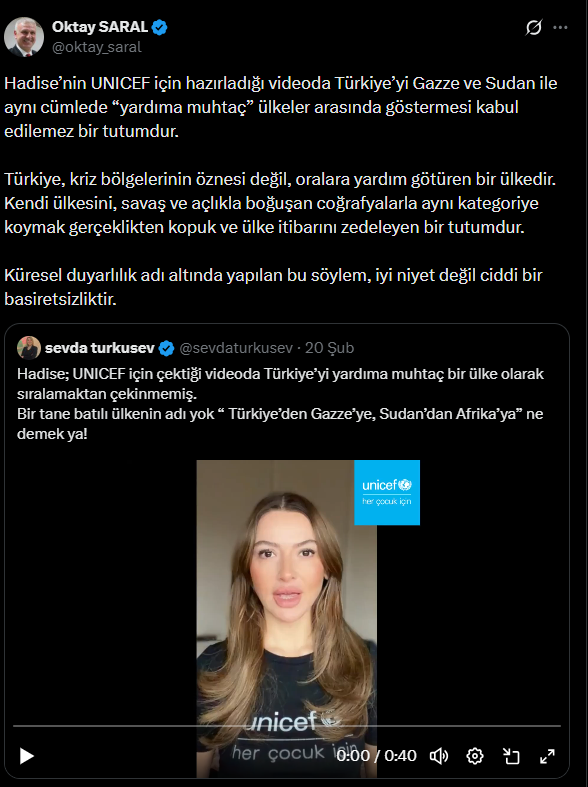 Cumhurbaşkanı Başdanışmanı Oktay Saral, videodaki sözlere sosyal medya hesabından tepki gösterdi. Saral, “Hadise’nin UNICEF için hazırladığı videoda Türkiye’yi Gazze ve Sudan ile aynı cümlede ‘yardıma muhtaç’ ülkeler arasında göstermesi kabul edilemez bir tutumdur” dedi.