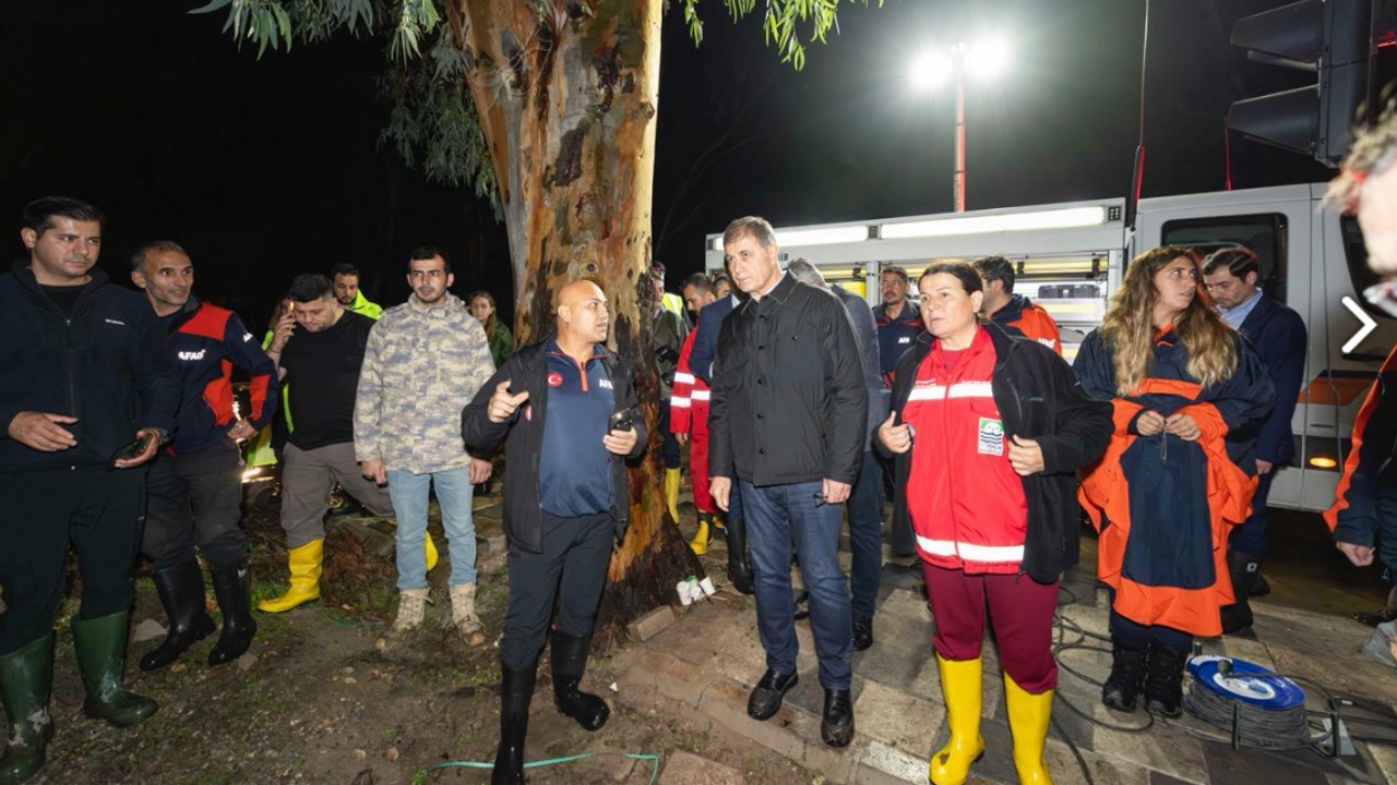 Aşırı yağış sonrası bölgede sel ve taşkın yaşanan noktalarda İzmir Büyükşehir Belediye Başkanı Cemil Tugay, İZSU Genel Müdürü Gürkan Erdoğan ve İzmir İtfaiye Dairesi Başkanı Yaşar Korkmaz incelemelerde bulundu.