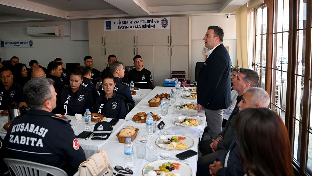 Başkan Vekili Tahsin Demirtaş güne Kuşadası Belediyesi Zabıta Müdürlüğü'nü ziyaret ederek başladı. Zabıta personeliyle birlikte kahvaltı yapan Başkan Vekili Demirtaş'a Kuşadası Belediye başkan yardımcıları da eşlik etti. Samimi bir atmosferde geçen buluşmada, belediye hizmetlerinin sahadaki önemi ve ekip çalışmasının değeri vurgulandı. Zabıta Müdürlüğü'nün kent genelindeki çalışmaları hakkında bilgi alan Başkan Vekili Tahsin Demirtaş, özveriyle görevlerini yapan personele teşekkür etti.