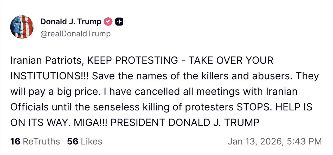 “Protestocuların anlamsız şekilde öldürülmesi durana kadar İranlı yetkililerle tüm görüşmeleri iptal ettim” diyen Trump'ın paylaşımında en dikkat çeken ifadelerden biri ise “Yardım yolda” sözleri oldu.