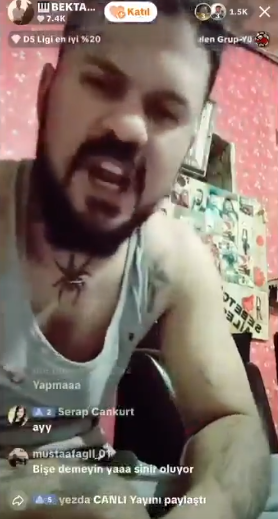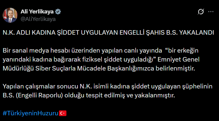 - "Bir sanal medya hesabı üzerinden yapılan canlı yayında “bir erkeğin yanındaki kadına bağırarak fiziksel şiddet uyguladığı” Emniyet Genel Müdürlüğü Siber Suçlarla Mücadele Başkanlığımızca belirlenmiştir.