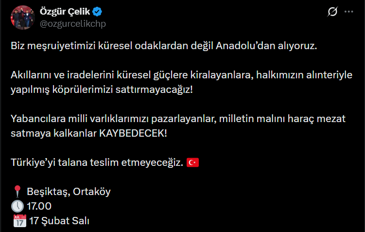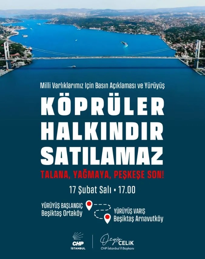 17 Şubat Salı günü saat 17.00’de Beşiktaş Ortaköy’den başlayıp Beşiktaş Arnavutköy’e kadar yürüyeceklerini duyuran Özgür Çelik, "Biz meşruiyetimizi küresel odaklardan değil Anadolu’dan alıyoruz" dedi. "Talana, yağmaya, peşkeşe son" diyen Çelik, yürüyüşe ilişkin sosyal medya hesabından yaptığı açıklamada şunlara yer verdi: