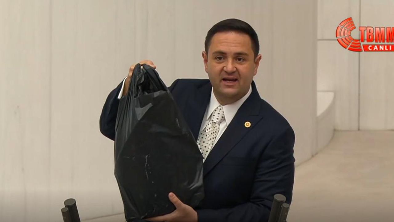 CHP Ankara Milletvekili Umut Akdoğan, iddianameyi siyah poşetle Meclis’e taşıyarak eleştirdi: “İçinde ayıplı şeyler var.” Akdoğan, iddianamedeki gizli tanık ifadelerinin kanıta dayandırılmadığını, çete liderinin dışarıda serbest dolaştığını ve belediye başkanlarının cezaevinde tutulduğunu söyledi.