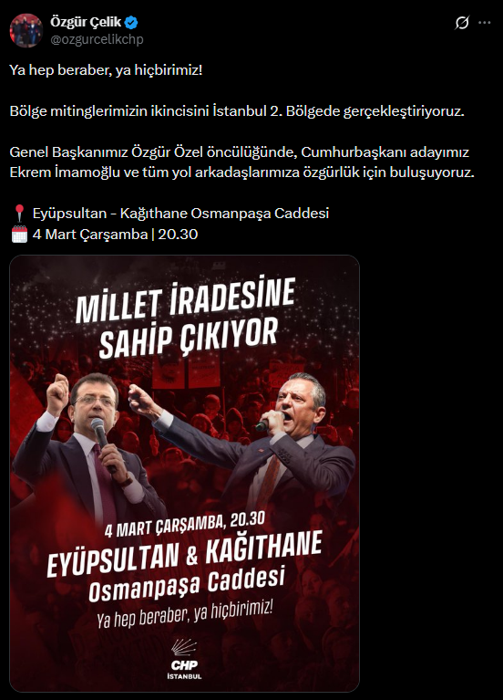 CHP İstanbul İl Başkanı Özgür Çelik, sosyal medya paylaşımında şu ifadeleri kullandı: