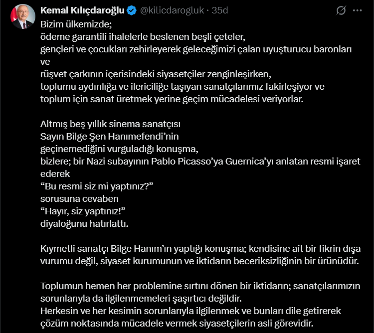 Cumhuriyet Halk Partisi’nin eski Genel Başkanı Kemal Kılıçdaroğlu, sosyal medya hesabından bir paylaşım yaptı.
