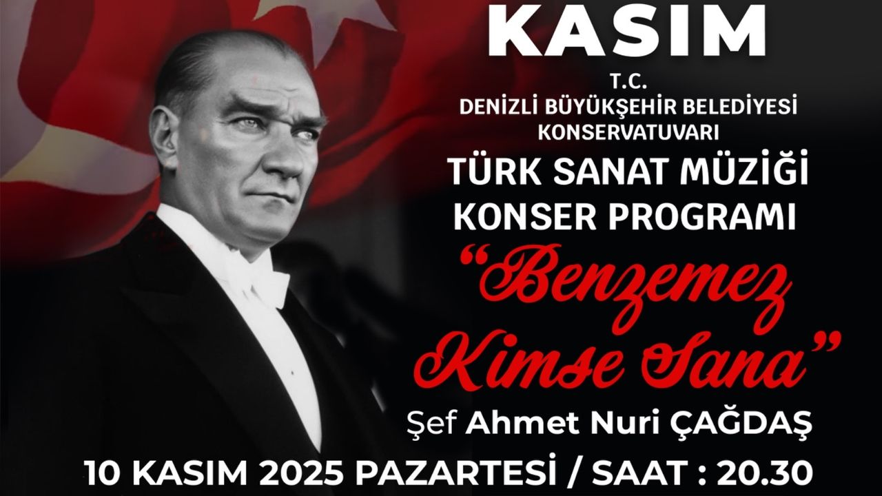 Denizlililer, Ata’ya olan sevgi ve minnetlerini göstermek üzere çelenk sunma töreninde bir araya gelecek. Aynı günün akşamında ise Büyükşehir Belediyesi, Ata’nın sevdiği şarkıların yankılanacağı özel bir konsere ev sahipliği yapacak. Denizli Büyükşehir Belediyesi Konservatuvarı Türk Sanat Müziği Korosu, “Benzemez Kimse Sana” adlı konser programıyla sahne alacak.