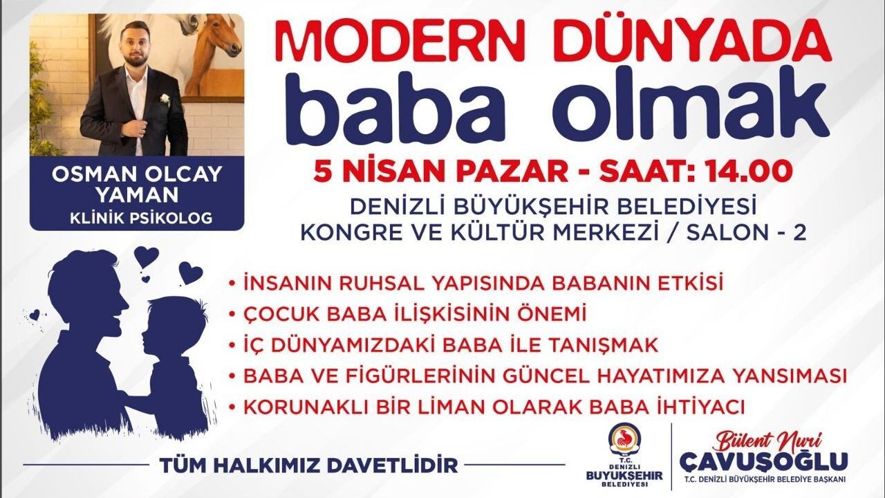 Denizli Büyükşehir Belediyesi, kültürel ve eğitici faaliyetlerine bir yenisini daha ekliyor. Modern yaşamın getirdiği hızlı değişimler içinde babalık makamının önemini ve sorumluluklarını ele alacak olan “Modern Dünyada Baba Olmak” semineri 5 Nisan Pazar günü saat 14.00’te DBB Kongre ve Kültür Merkezi S2 Salonu’nda gerçekleştirilecek. Klinik Psikolog Osman Olcay Yaman’ın konuşmacı olarak yer alacağı seminer; babalık rolünün çocuğun duygusal ve sosyal gelişiminde nasıl bir etki ettiğine odaklanacak. Modern çağın getirdiği zorluklarla başa çıkma yöntemleri, çocuklarla doğru ve sağlıklı iletişim kurmanın yolları, çocuğun karakter gelişiminde babanın etkisi, babaların günlük hayatta karşılaştığı sorunlar ve çözüm önerileri bu seminerde ele alınacak. Seminer, babaların hem bilgi edinmesi hem de kendi deneyimlerini diğer katılımcılarla paylaşması için interaktif bir zemin sunacak.