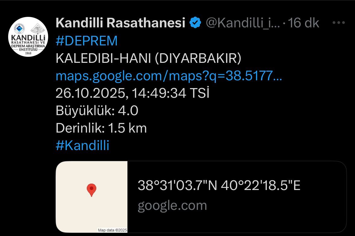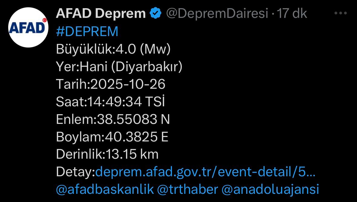 Afet ve Acil Durum Yönetimi Başkanlığı (AFAD) verilerine göre, Hani ilçesinde 4 büyüklüğünde deprem meydana geldi.