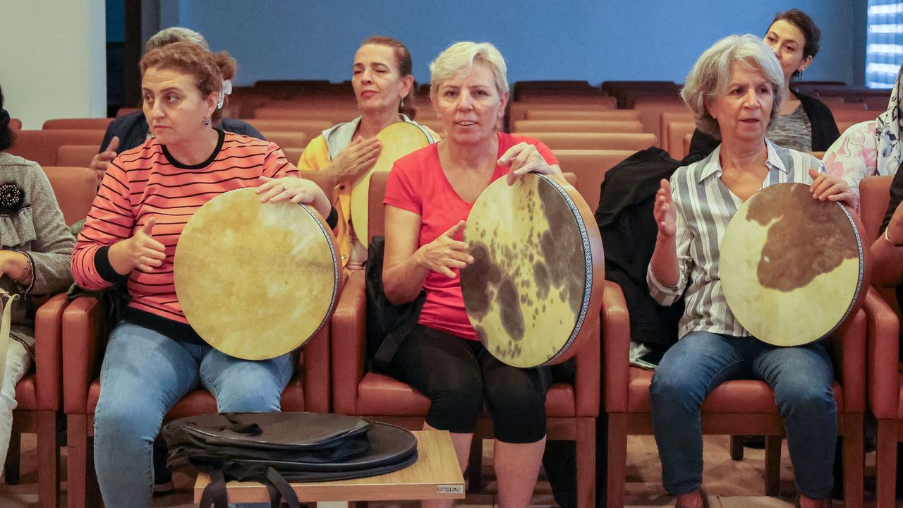 Bendir ve darbuka eşliğinde yankılanan sesler salonu doldururken, katılımcılar, uzman eğitmenler eşliğinde temel ritim tekniklerini öğrendi.