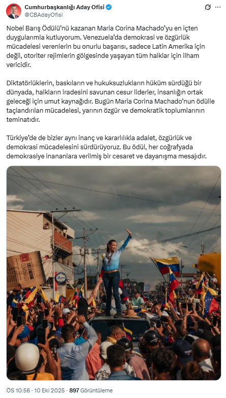 "Nobel Barış Ödülü’nü kazanan Maria Corina Machado’yu en içten duygularımla kutluyorum.
