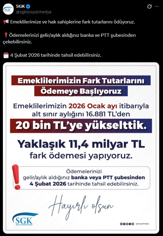 "Emeklilerimize ve hak sahiplerine fark tutarlarını ödüyoruz. Ödemelerinizi gelir/aylık aldığınız banka ve PTT şubesinden çekebilirsiniz. 4 Şubat 2026 tarihinde tahsil edebilirsiniz.”