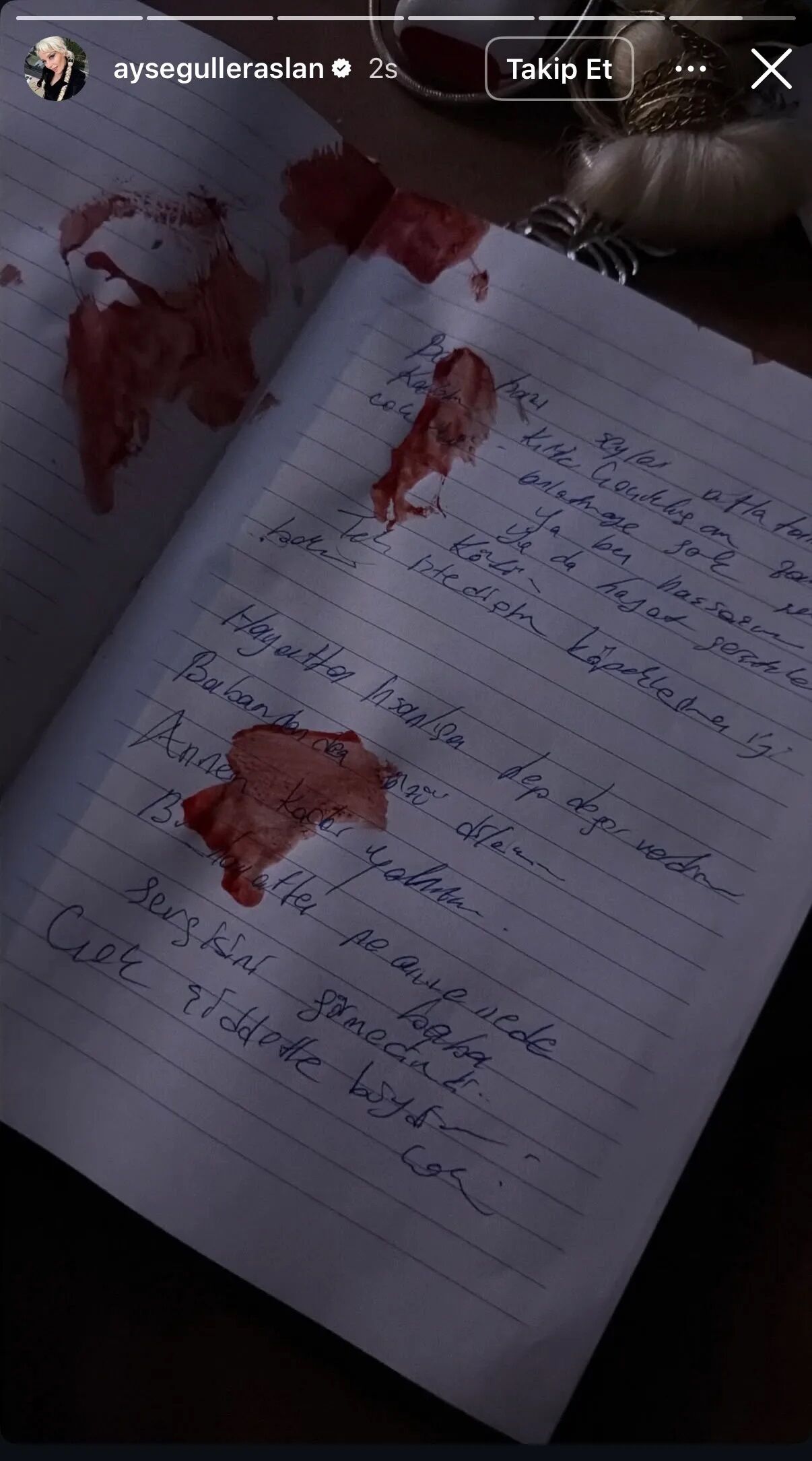 Başka bir paylaşımında ise "Ben hassasım ya da hayat gerçekten kötü. Tek istediğim köpeklerime iyi bakın. Hayatta insanlara hep değer verdim. Babamdan da özür dilerim. Bu hayatta ne anne ne de baba sevgisini görmedim çok şiddetle büyüdüm çok" yazılı kanlı notu paylaştığı görülmüştü.