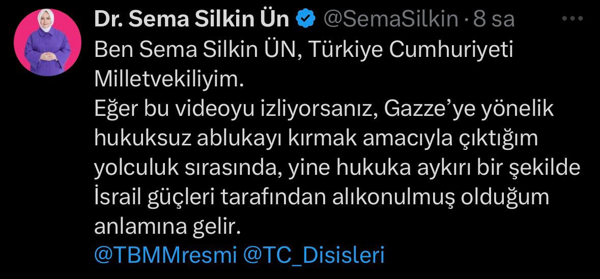 Vicdan gemisinde bulunan Gelecek Partisi Milletvekili Sema Silkin Ün'ün sosyal medya hesabından ün ile birlikte 2 milletvekilinin daha İsrail tarafından alıkonulduğu bilgisi yer aldı.