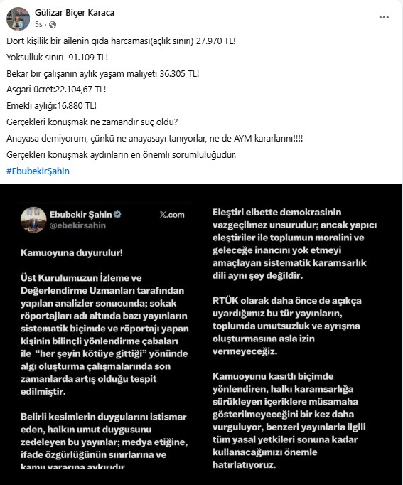 Sosyal ve ekonomik gerçeklere dikkat çeken CHP Denizli Milletvekili Gülizar Biçer Karaca, RTÜK Başkanı Ebubekir Şahin’in sokak röportajlarında “gerçekleri yansıtmayan yayınlar” yapıldığı yönündeki açıklamasına sert tepki gösterdi.