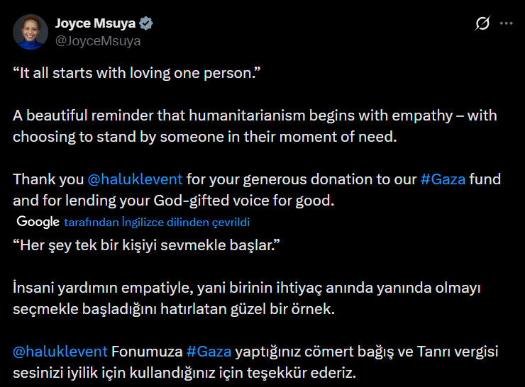 Msuya'nın paylaşımını alıntılayan gazeteci Razı Canıklıgil, Haluk Levent'in Finlandiya ve Ankara konserlerinin gelirini BM'nin Gazze yardım fonuna bağışladığını yazdı: