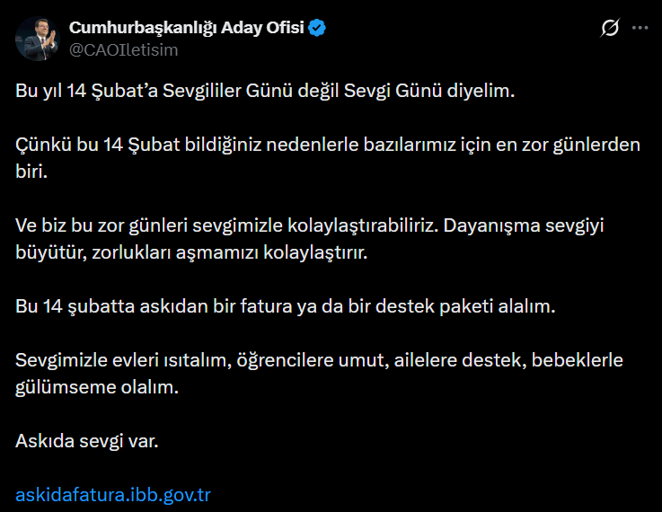 Askıda Fatura uygulaması için yurttaşlara çağrı yapan İmamoğlu, "Bu 14 şubatta askıdan bir fatura ya da bir destek paketi alalım" dedi.
