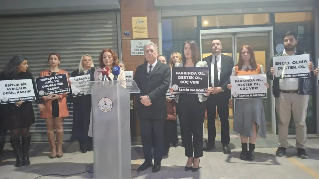 Alsancak Baro binasının önünde düzenlenen açıklamaya İzmir Baro Başkanı Avukat Sefa Yılmaz, Engelli Hakları Komisyonu üyeleri ve avukatlar katıldı.