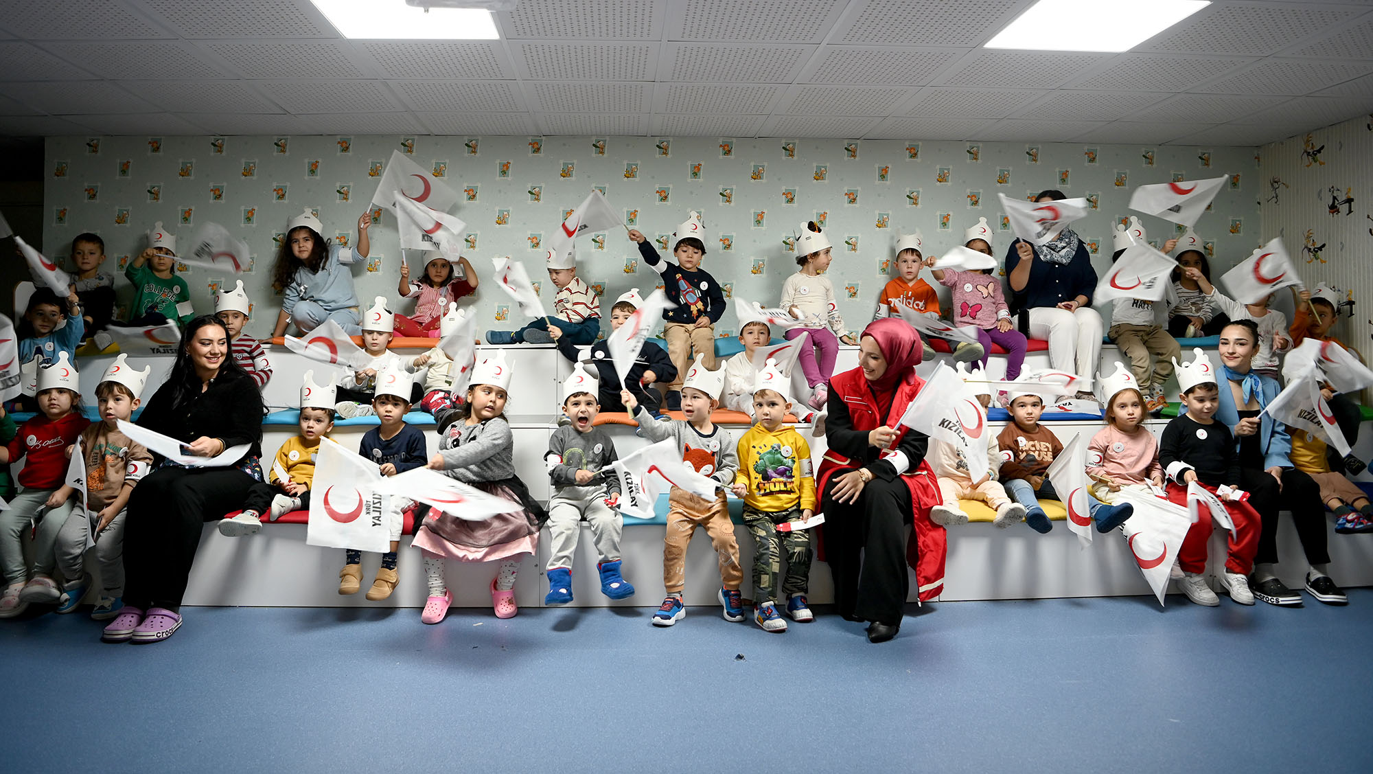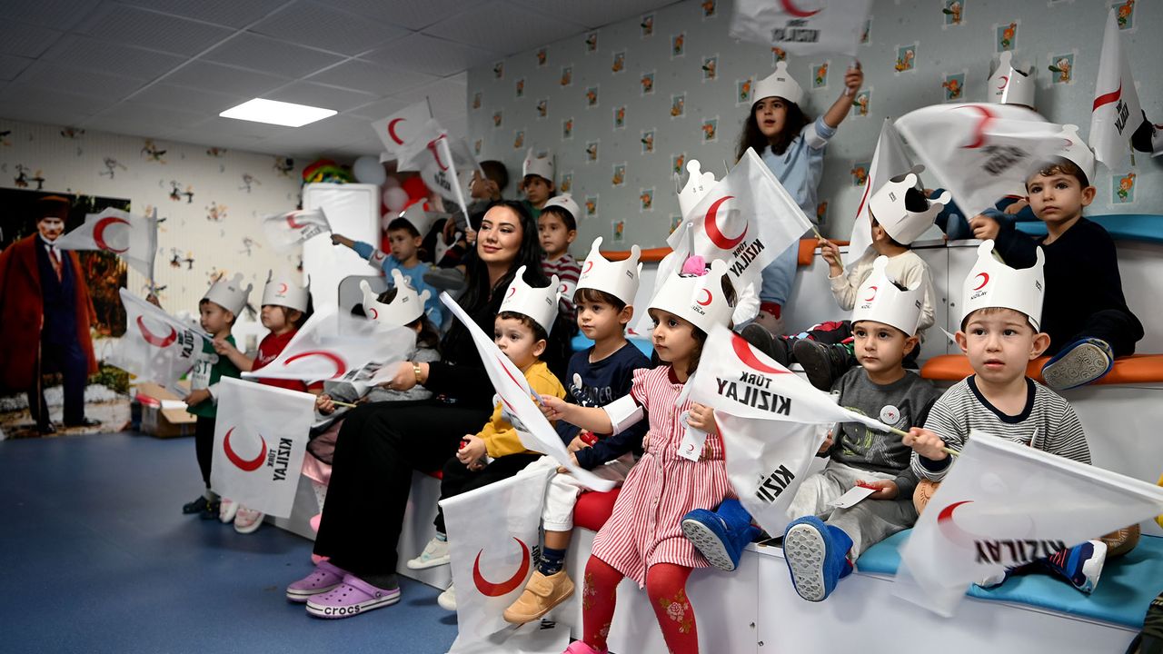 Çocuk Gelişim Merkezi'ndeki minik öğrenciler, Kızılay'ın tanıtımını ve temel ilkelerini eğlenceli bir dille anlatan çizgi filmi ilgiyle izledi.