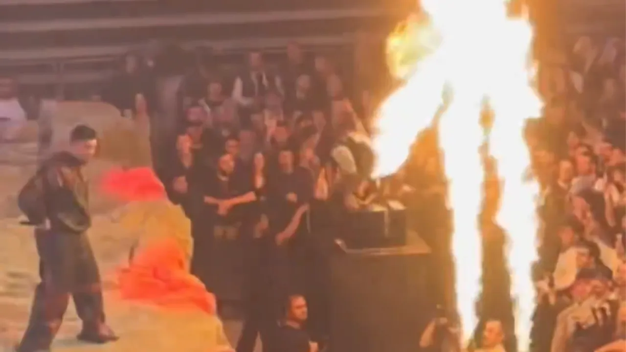 Sosyal medyada paylaşılan bir görüntüde, sahneye atlamaya çalışan bir hayranının güvenlik bariyerlerine takıldığı ve bu sırada kalçasının alevlerden tutuştuğu görüldü.