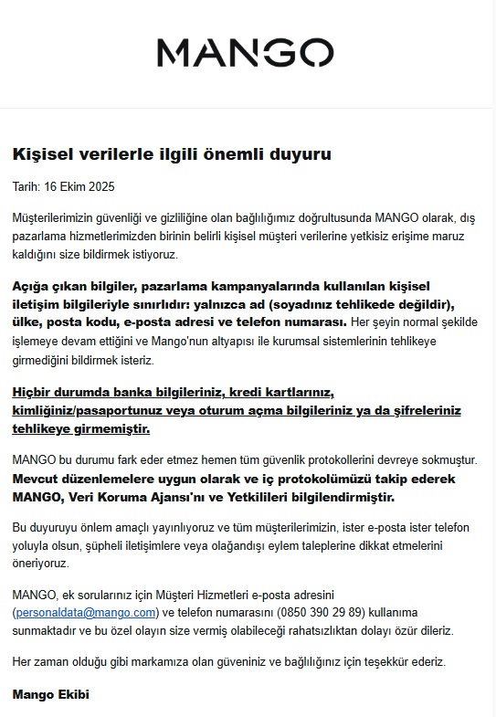 Müşterilerimizin güvenliği ve gizliliğine olan bağlılığımız doğrultusunda Mango olarak, dış pazarlama hizmetlerimizden birinin belirli kişisel müşteri verilerine yetkisiz erişime maruz kaldığını size bildirmek istiyoruz.