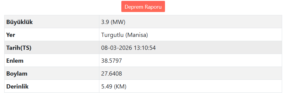 AFAD, Manisa'nın Turgutlu ilçesinde 3,9 büyüklüğünde bir deprem meydana geldiğini açıkladı.