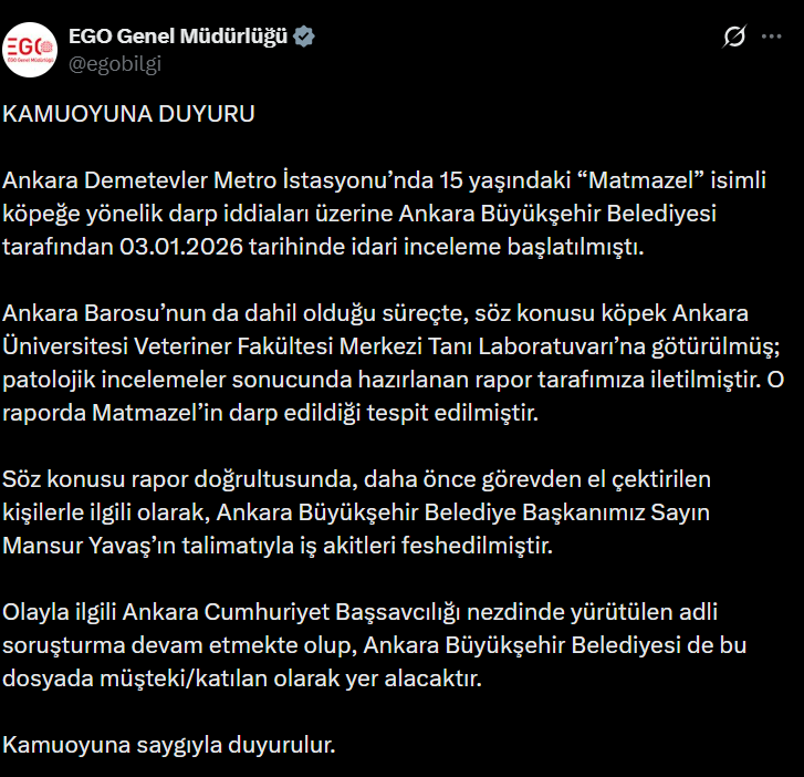 “Ankara Demetevler Metro İstasyonu’nda 15 yaşındaki “Matmazel” isimli köpeğe yönelik darp iddiaları üzerine Ankara Büyükşehir Belediyesi tarafından 03.01.2026 tarihinde idari ve adli inceleme başlatılmıştı.