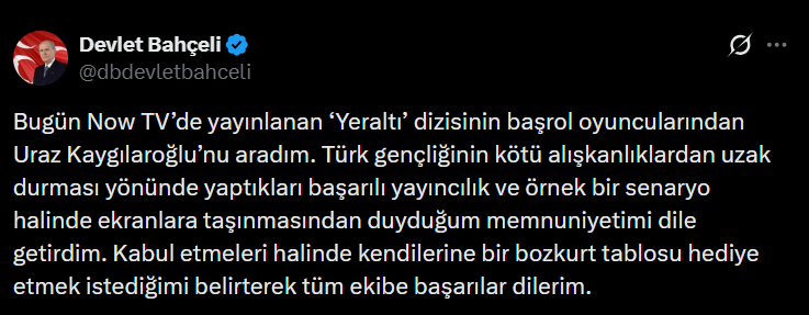 "Bugün Now TV’de yayınlanan ‘Yeraltı’ dizisinin dizisinin baş rol oyuncularından Uraz Kaygılaroğlu’nu aradım" ifadesini kullanan Bahçeli, sosyal medya hesabından yaptığı açıklamada şunlara yer verdi: