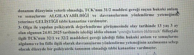 9 Eylül Üniversitesi Tıp Fakültesi Adli Tıp Anabilim Dalı Kurulu’nun 14.10.2025 tarihli raporu ile sanığın “atılı kasten öldürme eylemini kavrama ve öngörme yeteneğinin gelişmiş olduğu, TCK 31/2 bakımından suçun anlam ve sonuçlarını algılayabildiği, fiil ile ilgili davranışlarını yönlendirme yeteneğinin azalmasına sebep olacak düzeyde bir psikiyatrik tanısının olmadığı tıbbi kanaatine” varılmıştır.