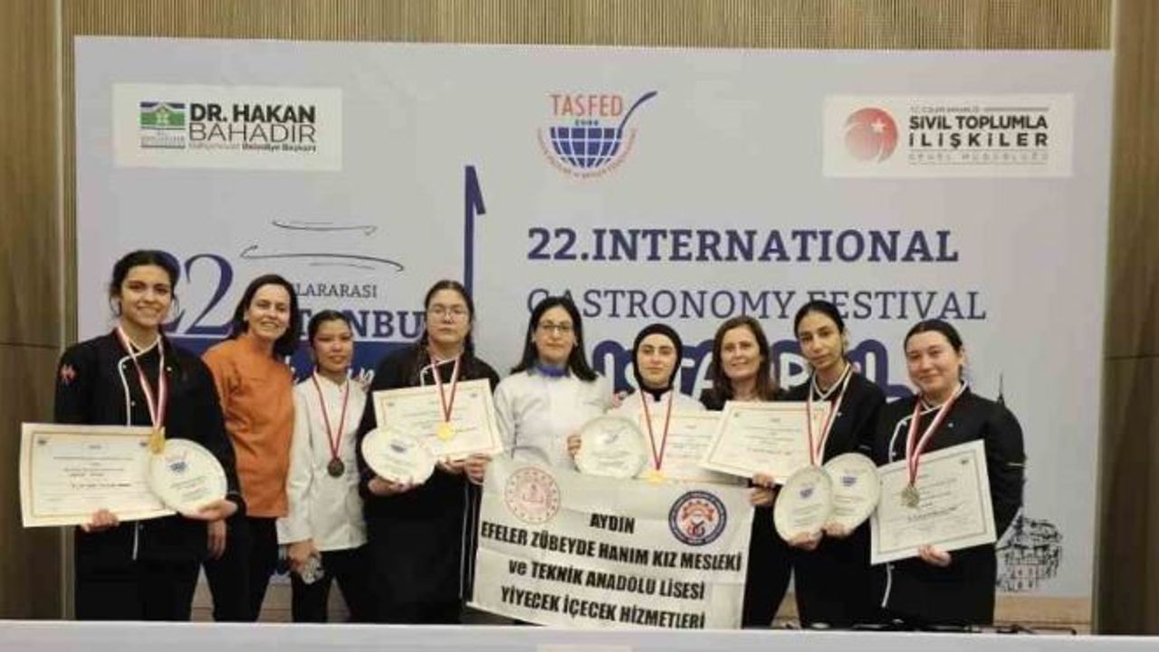Efeler Zübeyde Hanım Kız Mesleki ve Teknik Anadolu Lisesi İstanbul’da düzenlenen Gastronomi Festivali’nde 4’ü altın toplamda 6 madalya ile Aydın’a döndü. 22. İstanbul Uluslararası TAŞFED Gastronomi Festivali kapsamında düzenlenen ve 26 ülkeden 1500 yarışmacının katıldığı yemek yarışmasına Efeler Zübeyde Hanım Kız Mesleki ve Teknik Anadolu Lisesi Yiyecek İçecek Hizmetleri Alanı’ndan 6 öğrenci ve 3 öğretmenimiz katılım sağladı. Zübeyde Hanım Kız Mesleki ve Teknik Anadolu Lisesi 3 ana yemek tabağı, 2 tatlı tabağı ve 1 balık tabağı ile yarışmada yer aldı. İHA
