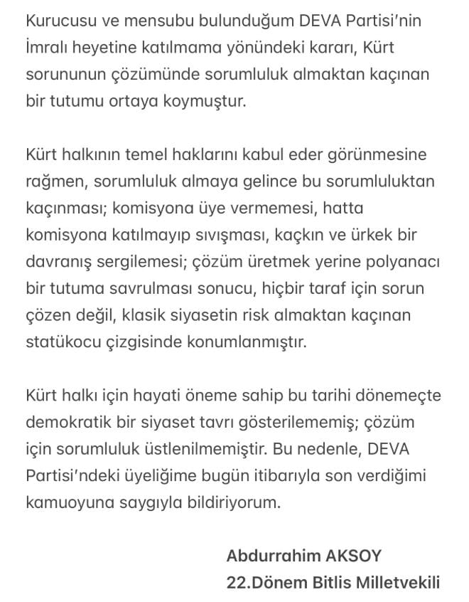 - Kürt halkı için hayati öneme sahip bu tarihi dönemeçte demokratik bir siyaset tavrı gösterilememiş; çözüm için sorumluluk üstlenilmemiştir. Bu nedenle, DEVA Partisi'ndeki üyeliğime bugün itibarıyla son verdiğimi kamuoyuna saygıyla bildiriyorum."