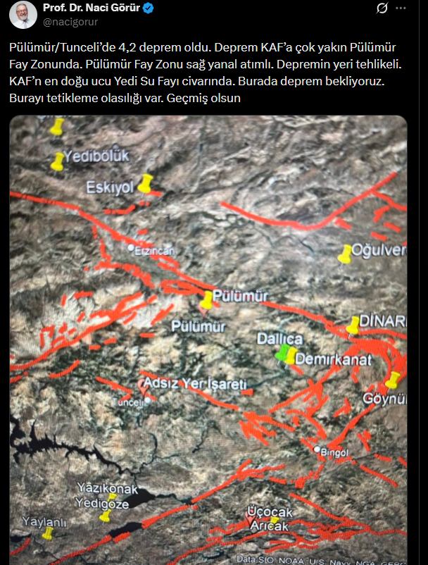 Depremin Kuzey Anadolu Fay Hattı'na çok yakın Pülümür Fay Zonunda olduğunu belirten Görür, "Depremin yeri tehlikeli. KAF’ın en doğu ucu Yedi Su Fayı civarında. Burada deprem bekliyoruz. Burayı tetikleme olasılığı var" ifadelerini kullandı.