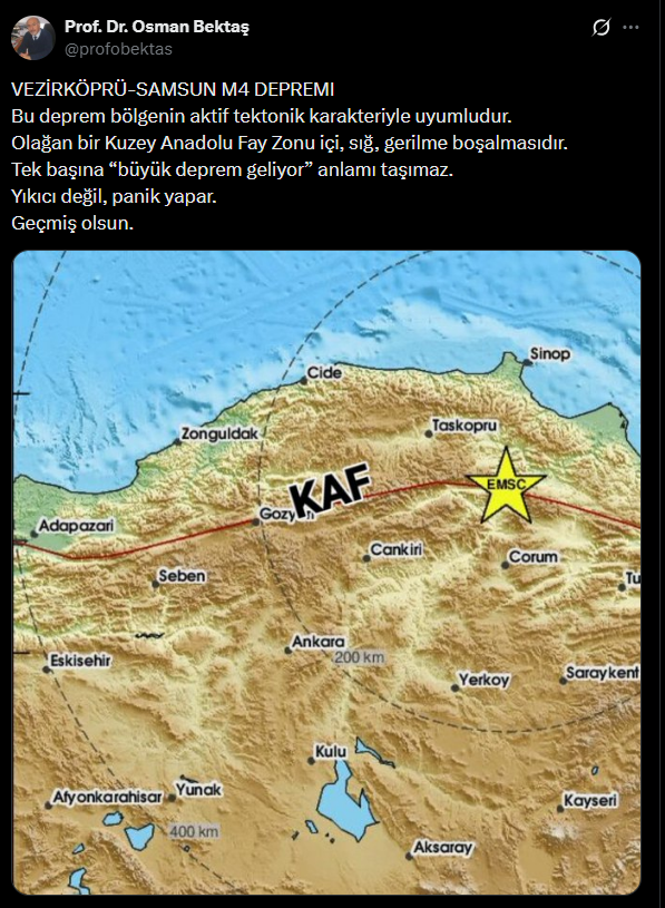 Bu deprem bölgenin aktif tektonik karakteriyle uyumludur. Olağan bir Kuzey Anadolu Fay Zonu içi, sığ, gerilme boşalmasıdır. Tek başına ‘büyük deprem geliyor’ anlamı taşımaz. Yıkıcı değil, panik yapar. Geçmiş olsun.”