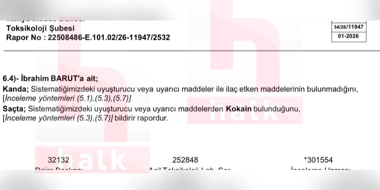 Uyuşturucu soruşturmasında gözaltına alınan İbrahim Barut'a ait uyuşturucu test sonucu