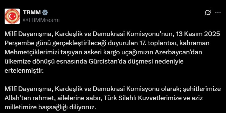 "Millî Dayanışma, Kardeşlik ve Demokrasi Komisyonu’nun, 13 Kasım 2025 Perşembe günü gerçekleştirileceği duyurulan 17. toplantısı, kahraman Mehmetçiklerimizi taşıyan askeri kargo uçağımızın Azerbaycan'dan ülkemize dönüşü esnasında Gürcistan’da düşmesi nedeniyle ertelenmiştir.