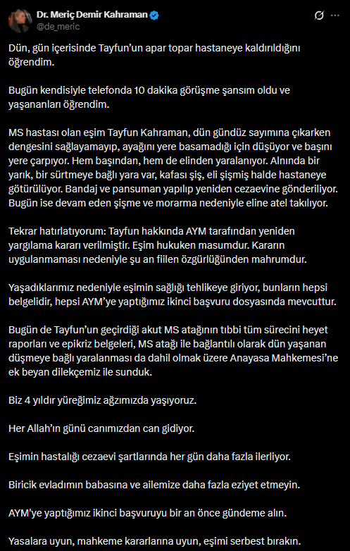 Bugün de Tayfun’un geçirdiği akut MS atağının tıbbi tüm sürecini heyet raporları ve epikriz belgeleri, MS atağı ile bağlantılı olarak dün yaşanan düşmeye bağlı yaralanması da dahil olmak üzere Anayasa Mahkemesi’ne ek beyan dilekçemiz ile sunduk.