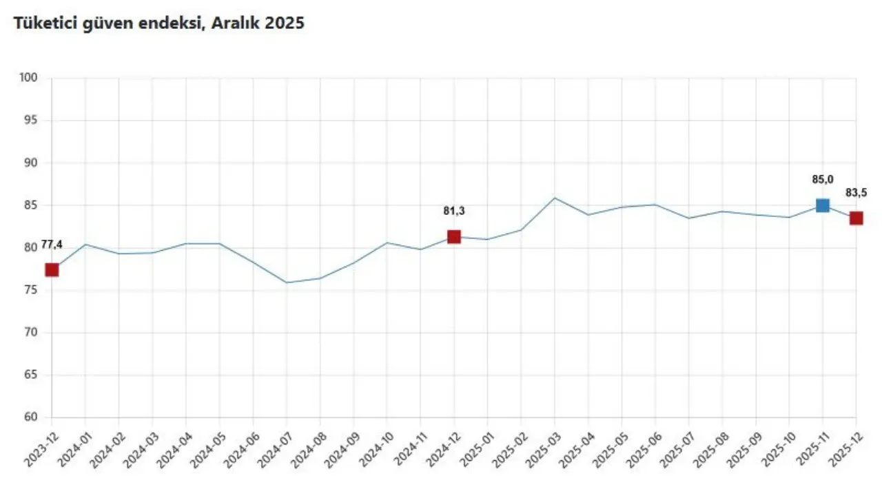 Türkiye İstatistik Kurumu (TÜİK), Aralık 2025 dönemine ait tüketici güven endeksi verilerini yayımladı. Buna göre, tüketici güven endeksi bir önceki ay olan kasıma kıyasla yüzde 1,8 oranında azalarak 83,5’e geriledi.